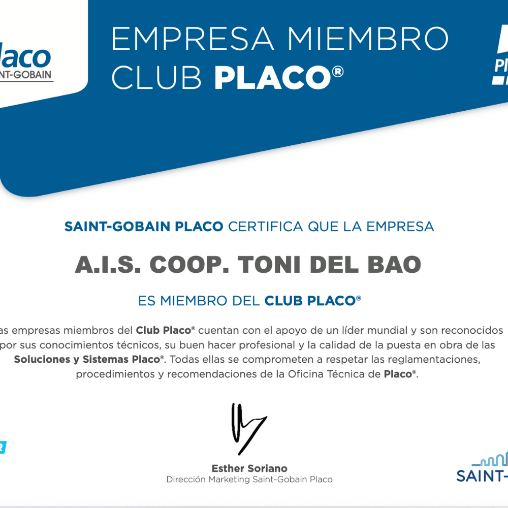 En AI DEL BAO – Soluciones Constructivas aportamos más de 13 años de experiencia ofreciendo confianza, innovación y calidad en cada proyecto. Nuestra trayectoria en sistemas constructivos de interiores y fachadas se respalda con la certificación como miembro del Club Placo®, otorgada por Saint-Gobain Placo, líder mundial en soluciones sostenibles para la edificación.
